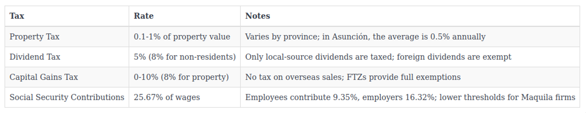 - Free Trade Zones (FTZ): Provide 0% duties on imports/exports and various incentives in Villeta and Alto Paraná.